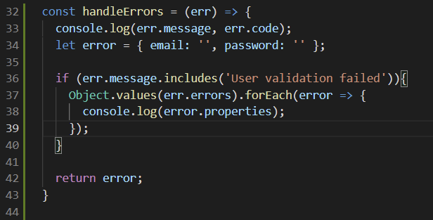 error 내용이 전부 다 필요한 것이 아니므로, 우리가 필요한 error안에 email: { ... } 혹은 password: { ... } 부분만 살펴보기 위해 error를 파싱해주자. handleErrors에 36~38 line과 같은 코드를 추가해준 후 postman을 통해 invalid한 값을 request로 보내주면