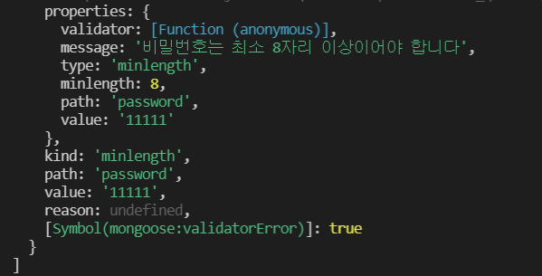 error message를 살펴봄으로써 error code를 갖는 error는 code를 통해 구분할 수 있고, 그 외의 error들은 'User validation failed' 라는 문자열이 공통적으로 출력됨을 알 수 있다.