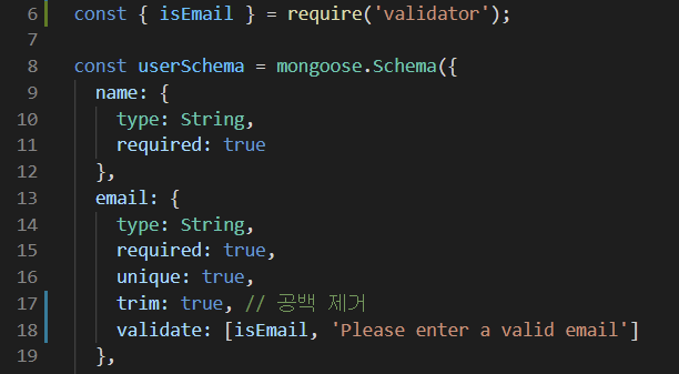 사용자가 입력한 이메일 형식을 검사하기 위한 방법으로는 서드파티 모듈인 validator를 사용했다. 6번 line 처럼 require 후 18번 라인처럼 에러메시지를 작성해주었다. 사용자가 입력한 내용이 자동으로 isEmail로 넘어가 유효성검사를 하게 된다.
