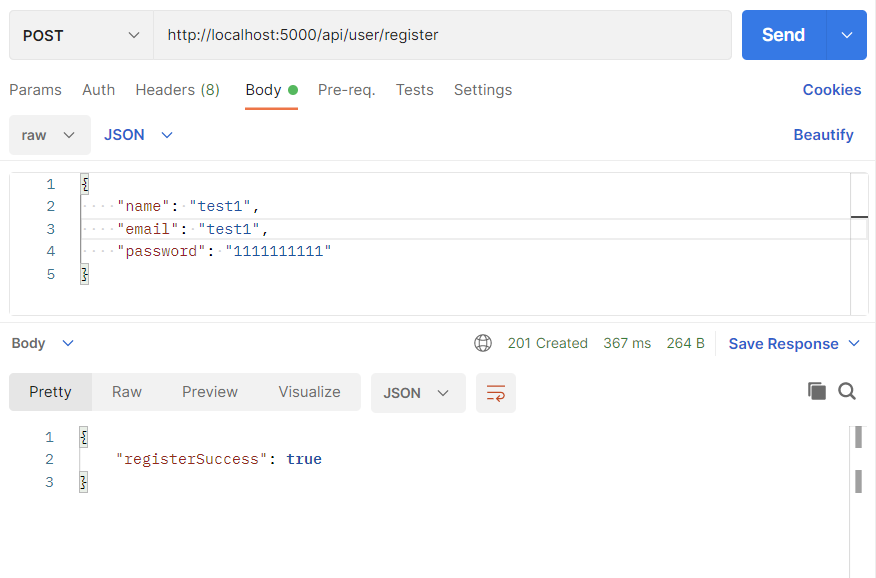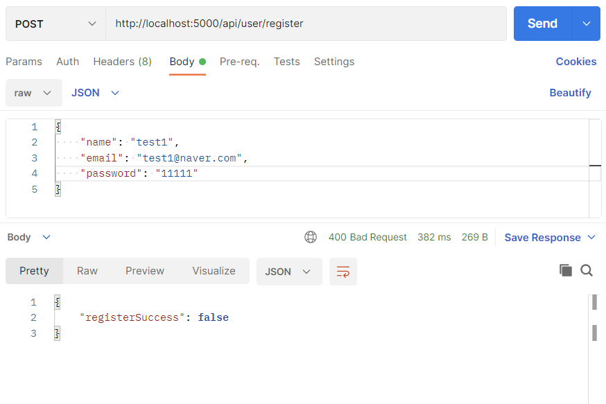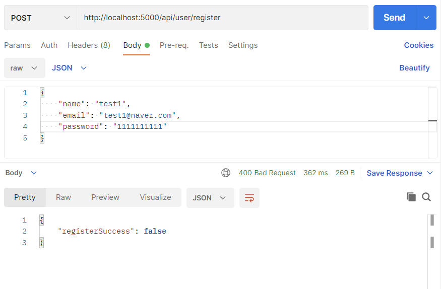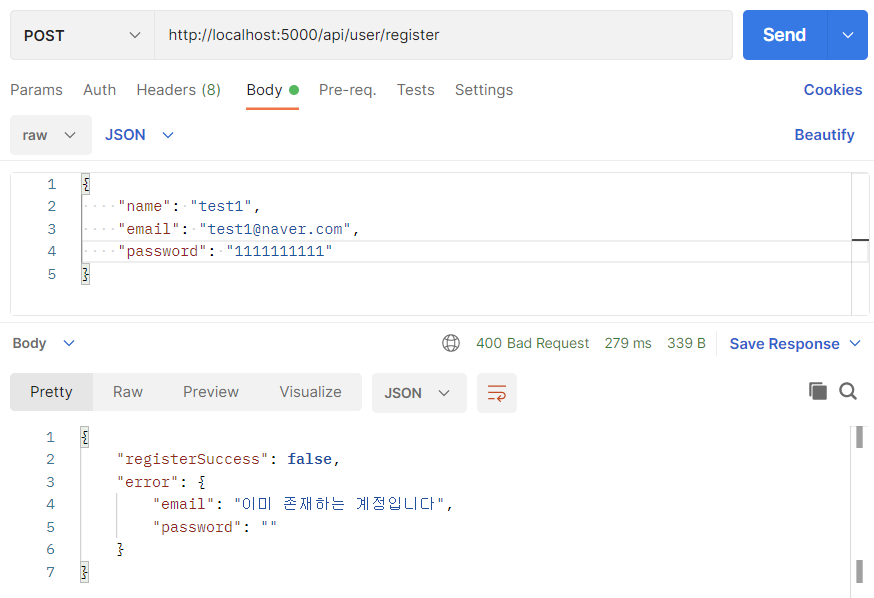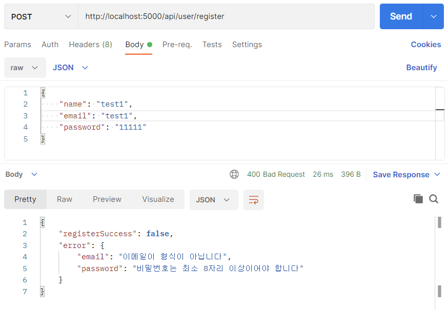 postman 화면에서 볼 수 있듯 이메일 형식, 비밀번호 길이, 이미 존재하는 계정에 대한 에러가 정상적으로 json으로 전달됨을 확인할 수 있다.