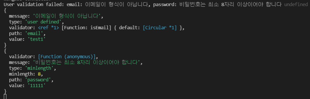 error message를 살펴봄으로써 error code를 갖는 error는 code를 통해 구분할 수 있고, 그 외의 error들은 'User validation failed' 라는 문자열이 공통적으로 출력됨을 알 수 있다.