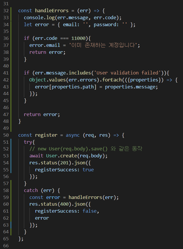 - err.message가 'User validation failed' 를 포함할 경우 혹은 err.code가 11000과 일치할 경우, 어떠한 동작을 하도록 if문 작성