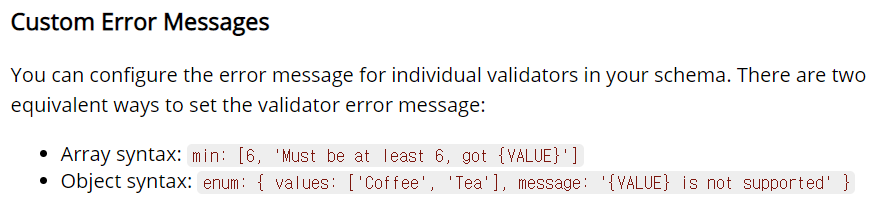 각각의 validator를 위한 custom error message를 설정할 수 있으며, error message를 설정하는 방법에는 'Array syntax', 'Object syntax' 두 가지 방식이 있다.