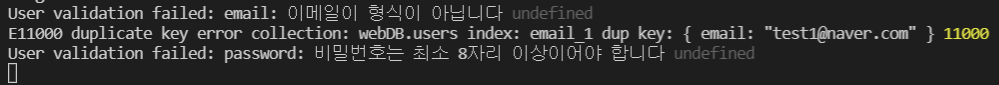 순서대로 이메일 형식 오류, 중복된 계정 입력, 비밀번호 길이 불충분에 따른 오류 메시지가 콘솔에 출력되는 것을 볼 수 있다. 앞에서 error code에 대해 말했듯이 첫 번째, 세 번째 error의 경우 문자열 마지막에 'undefined'가 에러 코드이고, 두 번째 error의 '11000' 이 중복에 대한 error code이다.