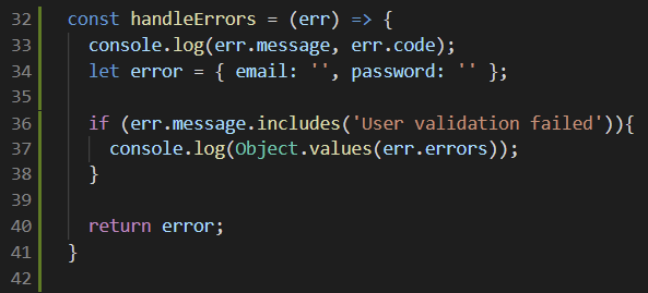 error 내용이 전부 다 필요한 것이 아니므로, 우리가 필요한 error안에 email: { ... } 혹은 password: { ... } 부분만 살펴보기 위해 error를 파싱해주자. handleErrors에 36~38 line과 같은 코드를 추가해준 후 postman을 통해 invalid한 값을 request로 보내주면