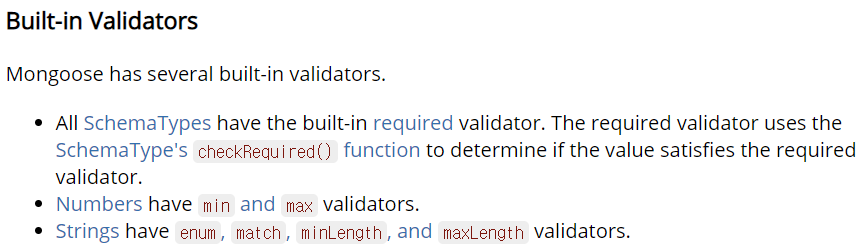 1. 모든 schematypes는 bulit-in 'required' validator를 가진다. required validator는 checkRequired() 함수를 이용하여 값이 조건을 만족하는지 결정한다.