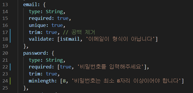 사용자가 입력한 이메일 형식을 검사하기 위한 방법으로는 서드파티 모듈인 validator를 사용했다. 6번 line 처럼 require 후 18번 라인처럼 에러메시지를 작성해주었다. 사용자가 입력한 내용이 자동으로 isEmail로 넘어가 유효성검사를 하게 된다.