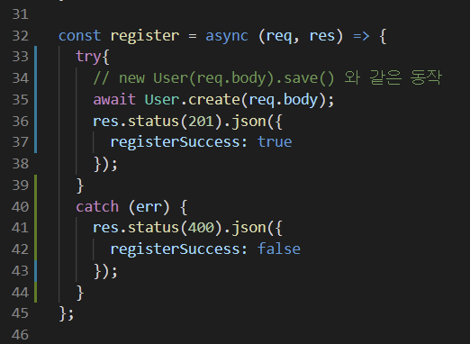 - 이미 존재하는 계정일 경우 : try ~ catch 덕분에 false가 출력되긴하나, 어떤 에러인지 클라이언트 입장에서는 알 수가 없음.