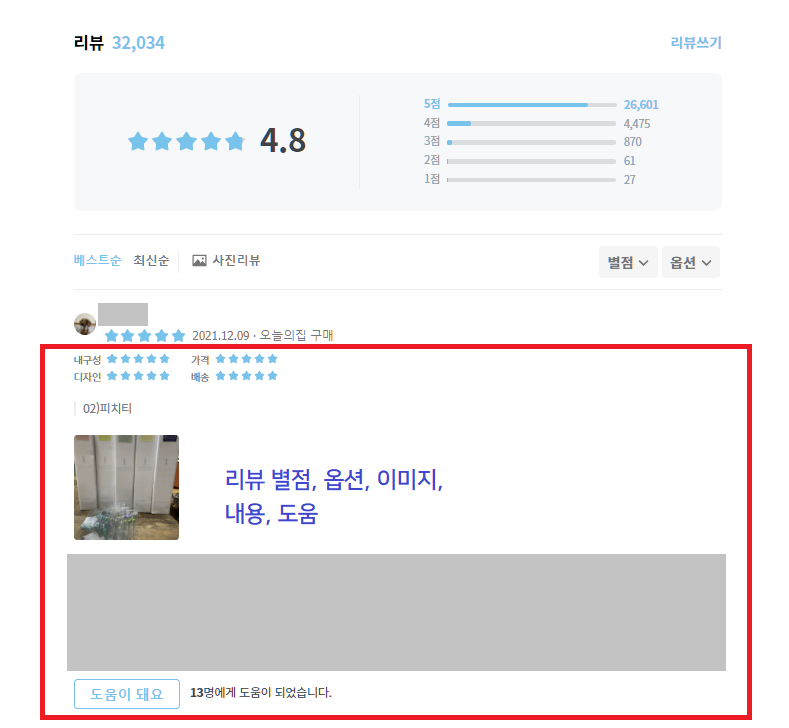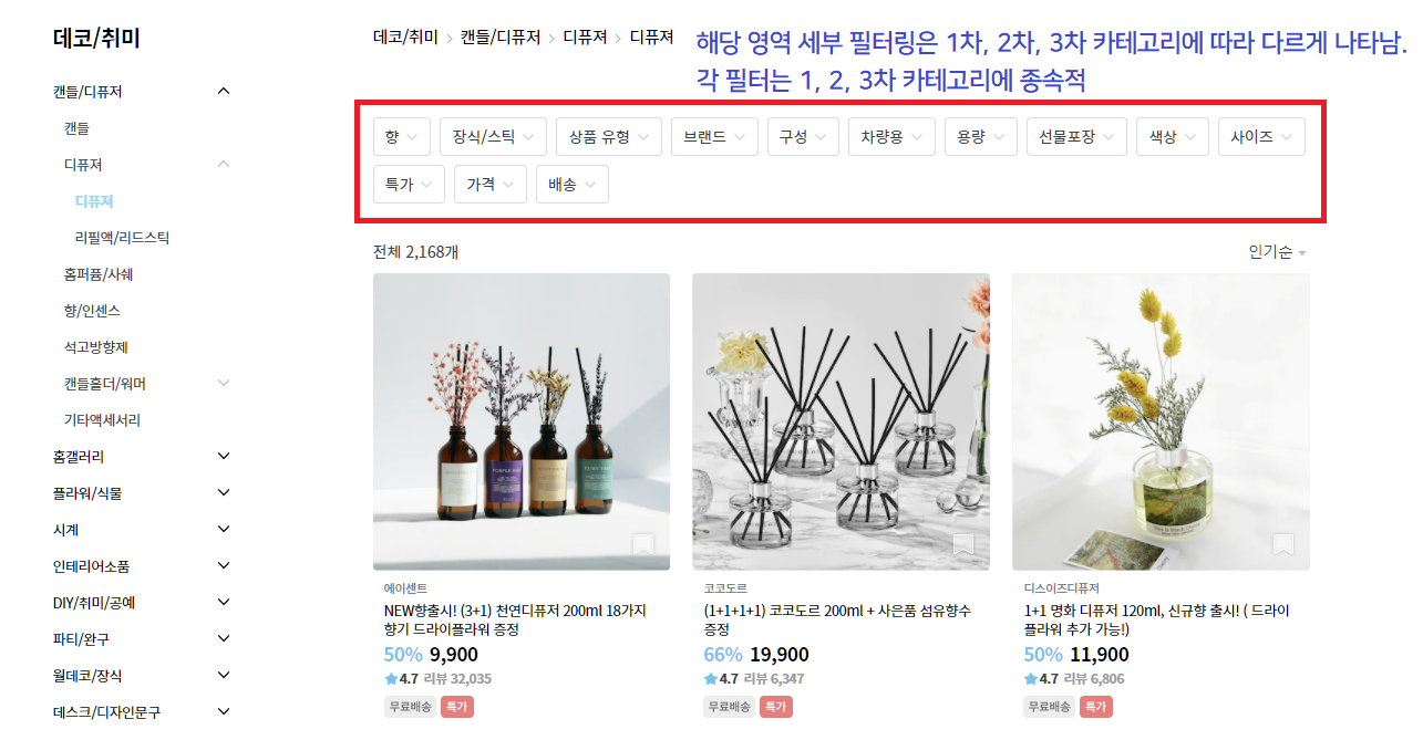 카테고리를 선택할 때마다 해당 카테고리가 가지는 필터로 상품을 다시 한 번 필터링할 수 있다.(1, 2, 3 차 카테고리 분류까지만 우선 구현, 각 카테고리별 필터링은 추후 논의) - 리뷰는 회원닉네임, 별점, 날짜, 회원이 선택한 옵션, 이미지, 글, 도움이 돼요(좋아요 기능과 같은) 정보를 갖는다.