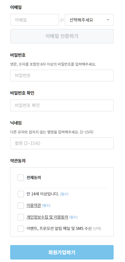- 회원가입에는 이메일, 비밀번호, 생년월일, 닉네임, 약관동의가 필요하다. (필수항목)
