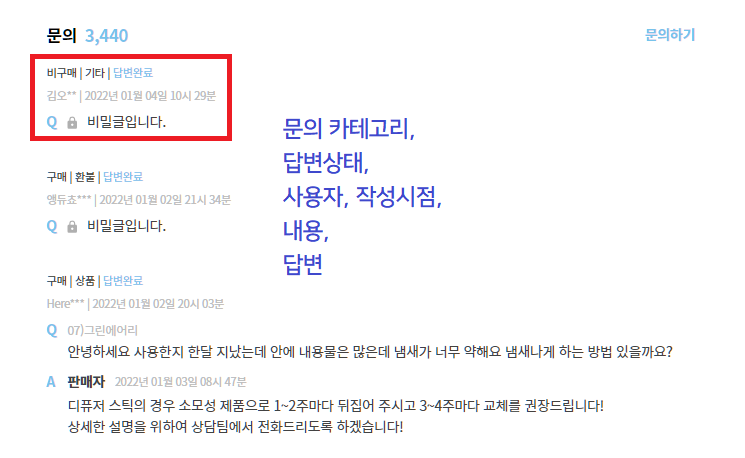 - 문의는 회원닉네임, 구매여부(구매, 비구매), 날짜, 카테고리, 상품 및 옵션 (선택 안 함 가능), 문의 내용, 답변유무(답변완료, 미답변) 정보를 가진다.