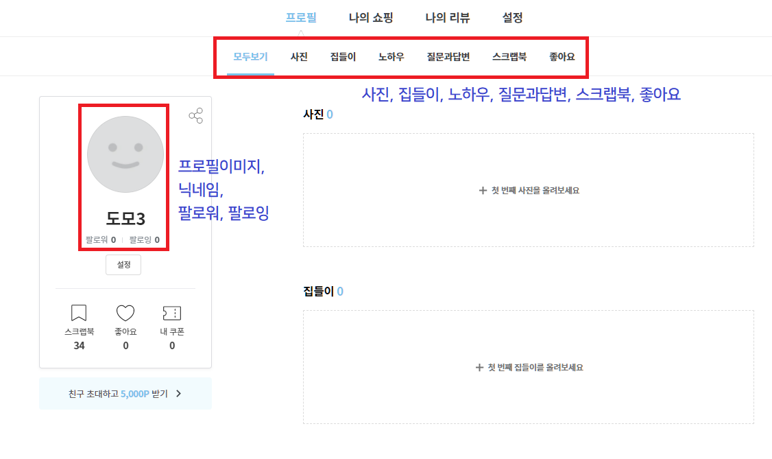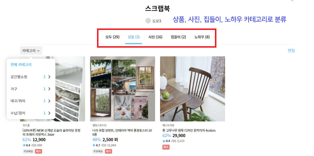 상품, 사진, 집들이, 노하우글들을 '스크랩북' 으로 저장하여 쉽게 찾아볼 수 있도록 관리할 수 있다. (상품, 스토리, 노하우로 분류하기로 결정) - 회원은 관리자와 일반 회원으로 나뉜다.