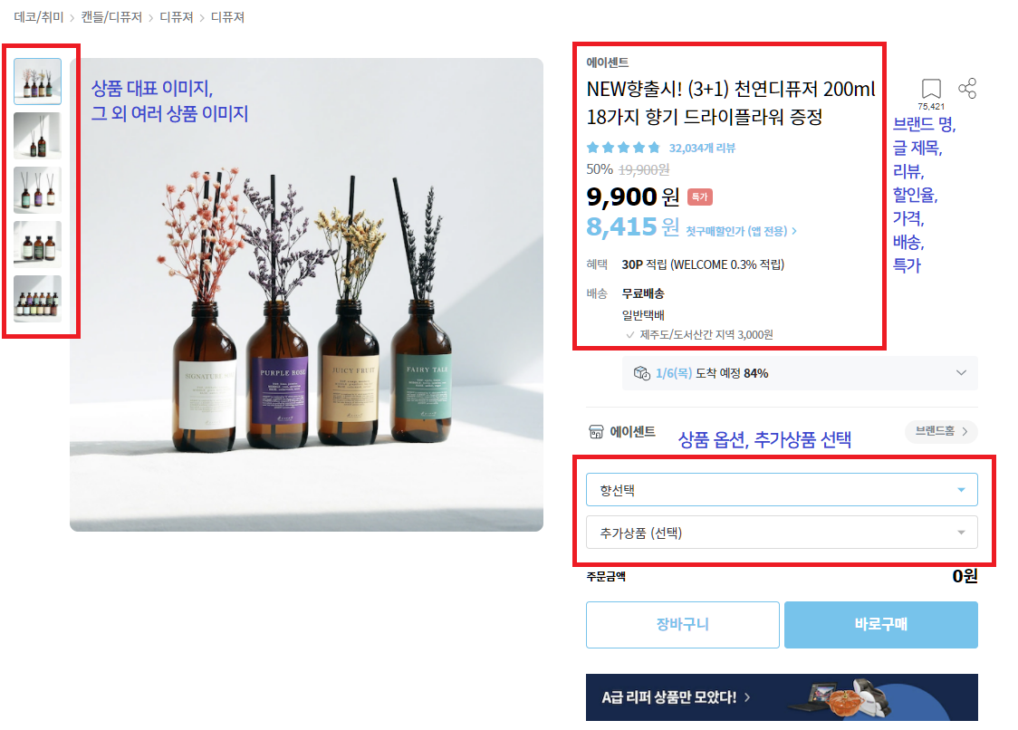 - 상품은 카테고리, 브랜드명, 이름, 대표이미지, 할인율, 가격, 별점, 리뷰, 배송방법(무료, 유료), 여러가지 옵션들, 옵션에 따라 달라지는 가격, 상품 관련 문의 정보를 갖는다.