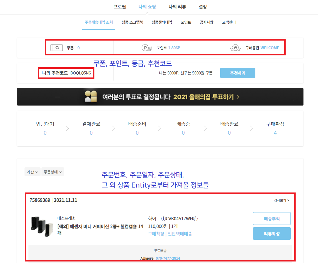 - 주문은 주문번호, 날짜, 상품이름, 옵션, 가격, 개수, 주문상태여부(취소, 환불, 교환, 배송중, 배송완료, 배송중), 배송방법(유료, 무료), 판매대표자 이름, 판매자 전화번호, 리뷰, 배송지(받는 사람, 연락처, 주소, 배송메모) 정보를 가진다.