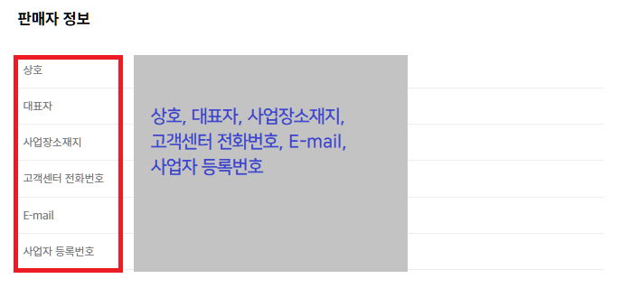 - 회원은 판매자가 될 수 있으며, 이 때 회사이름, 대표자이름, 사업장소재지, 고객센터 전화번호, E-mail, 사업자 등록번호 정보를 추가적으로 받는다.