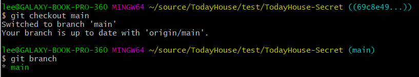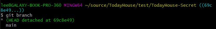 위 이미지와 같이 서브모듈을 추적하는 브랜치가 없음을 확인할 수 있다. 변경 내역을 추적하는 브랜치 없이 서브모듈을 (위 이미지에서 TodayHouse-Secret 안의 파일을) 수정하게 되면, 당연히 git 은 내가 수정한 내용을 main 브랜치와 연관짓지 못할 것이다.