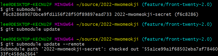 update 뒤에 --remote 를 붙여준다면, 현재 서브모듈 원격저장소에 저장되어있는 상태를 내 로컬로 가져오게 된다. 현재는 '서브모듈이 처음 등록된' 시나리오이므로, 2번과 3번의 차이가 없을 것이다. 하지만 서브모듈에 수정이 발생한다면 둘을 구분해서 바르게 써야한다. (즉, 지금은 둘의 차이를 몰라도 된다....)
