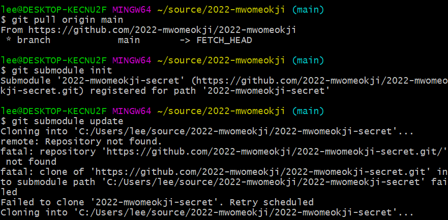 이 상태로 submodule 을 가져오려 한다면 submodule init 까지는 성공하지만, 가져오기 위한 update 는 실패하는 것을 볼 수 있다.