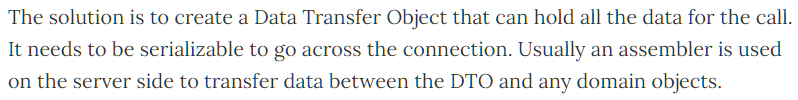 | P of EAA Catalog | Data Transfer Object An object that carries data between processes in order to reduce the number of method calls. For a full description see P of EAA page 401 When you're working with a remote interface, such as Remote Facade (388), ea