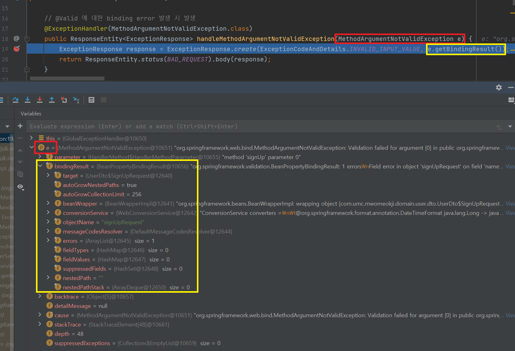위와 같이 중단점을 찍어서 디버깅모드로 살펴보았다. @Valid 에 걸리도록 예외를 낸 다음에 관찰해보니 일단 한 가지를 알 수 있었다.