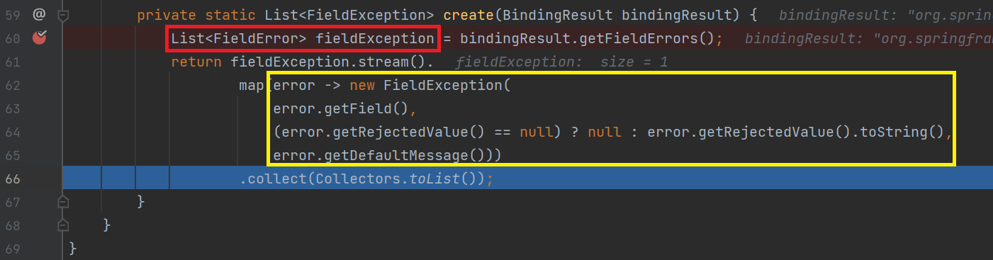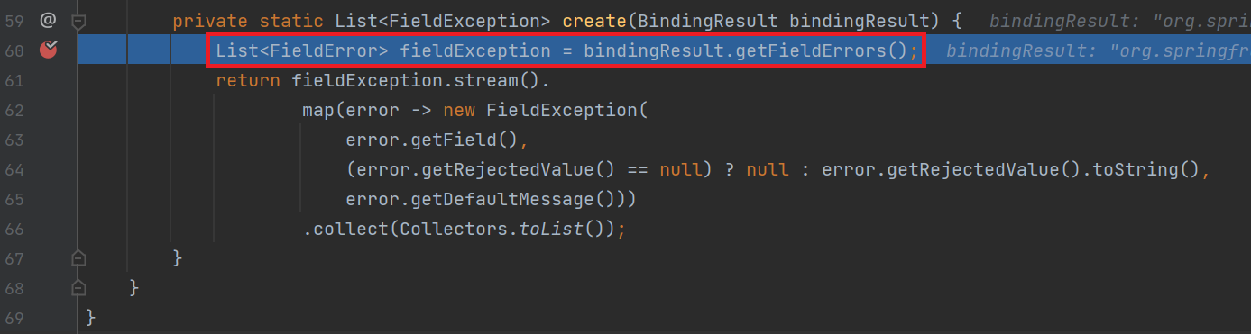 결과적으로 BindingResult.getFieldErrors() 를 통해 FieldError 로 이루어진 List 를 반환 받고, 각 원소를 돌면서 개발자가 작성한 FieldException 이라는 클래스의 각 필드에 매핑하는 작업을 수행한 것이다.