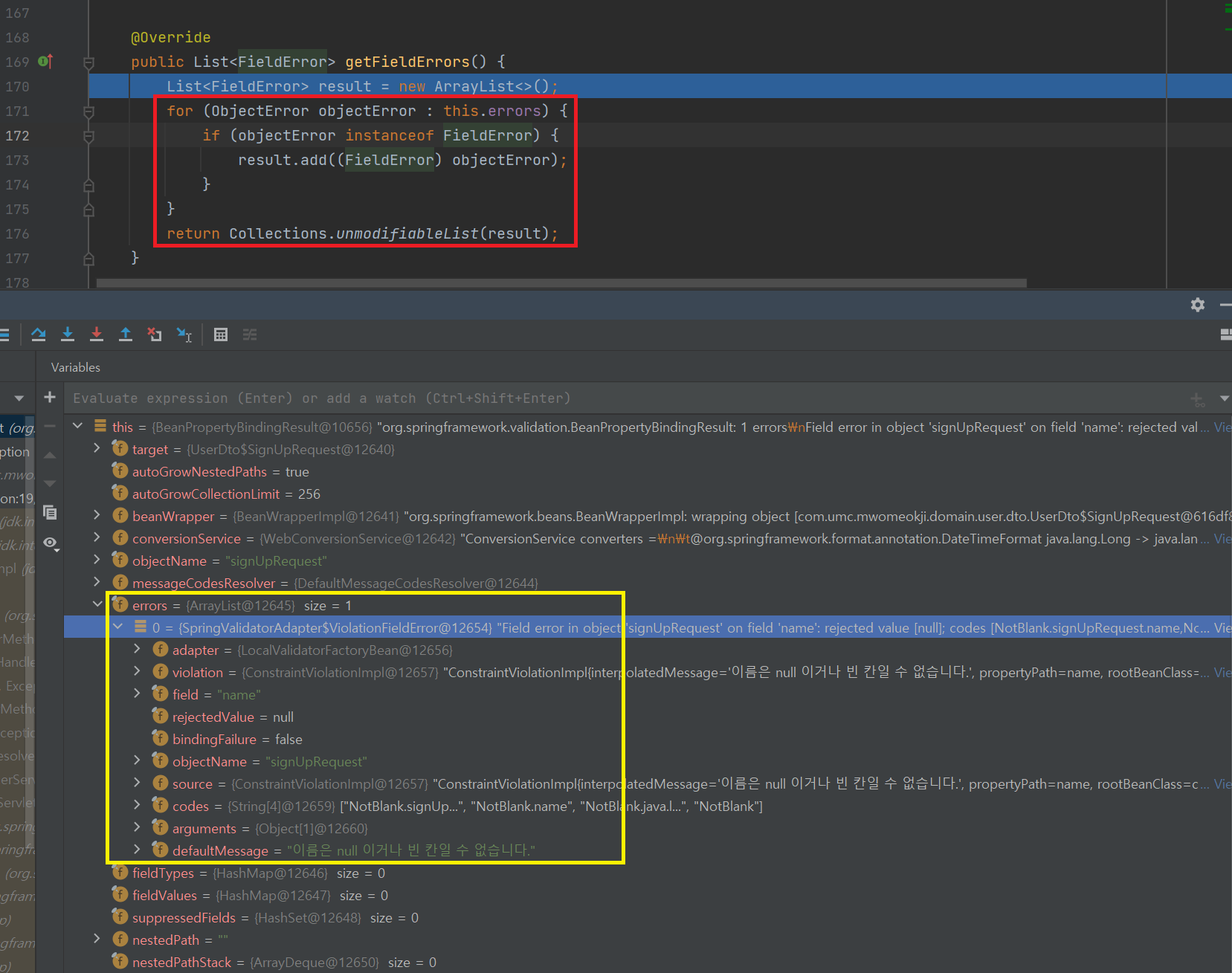 - MethodArgumentNotValidException 안에는 여러 필드가 있고, 그 중 bindingResult 안을 살펴보면 error 와 관련된 여러 값들이 담겨있다.