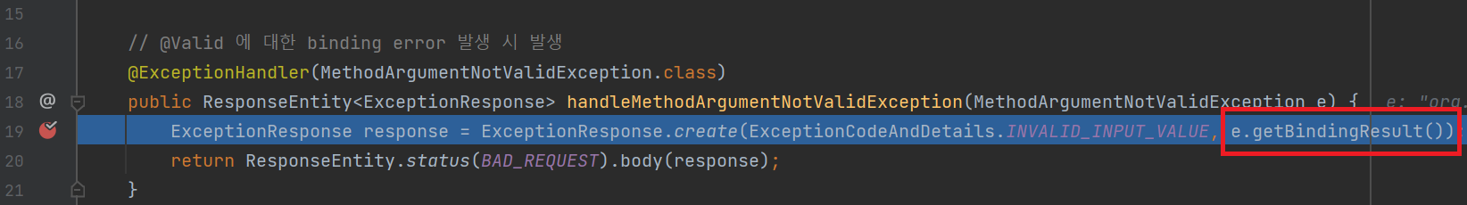 첫 번째 이미지에서 @Valid 는 MethodArgumentNotValidException 을 발생시키므로,MethodArgumentNotValidException e 를 파라미터로 받는 것 (line18) 까지는 이해가 되었다.