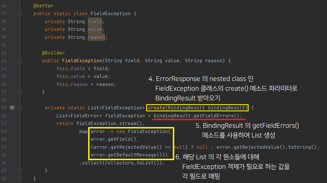 아래 코드에서 ExceptionResponse 는 공통 예외 응답을 위한 클래스, FieldException 은 예외가 발생한 필드, 값, 이유 를 포함하는 nested class 이다. (이해를 위해 모든 코드를 이미지로 올렸으니 create() 메소드만 잘 따라가면 된다.)