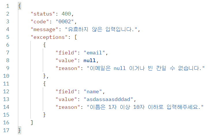 결과적으로 'exceptions' 배열에서 볼 수 있듯 예외에 해당하는 field, value, reason 이 매핑되어 나오는 것을 확인할 수 있다.