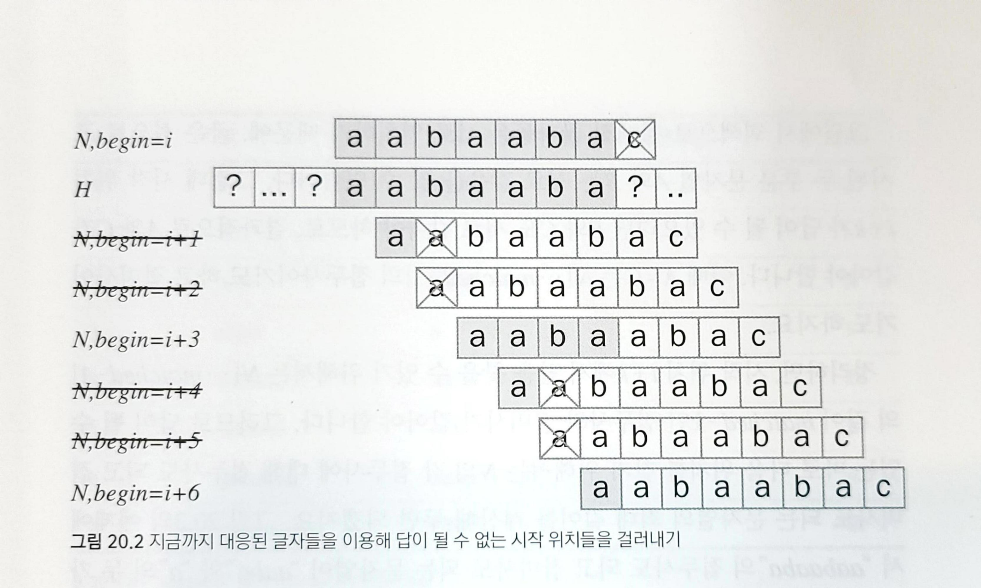 위의 예시에 대해 우선 브루트포스 알고리즘이 어떻게 동작하는지 생각해보자. T와 P 를 비교하던 중 i번째 인덱스(색칠된 첫 번째 a를 i 번째 인덱스라 하자) T[i] 와 P[0]가 일치하기 시작하여 이미지와 같이 T[i + 6], P[6] 까지 일치하였고, T[i + 7], P[7] 에서 불일치가 일어났다고 하자. 브루트포스 알고리즘의 경우 T[i + 7], P[7]에서 불일치를 확인한 후 "아, i는 답이 아니군, i + 1 부터 다시 비교를 시작하자" 라고 생각하고 단순히 한 칸을 옮겨 N, begin=i+1 과 같이 취소선이 그어져 있는 인덱스들을 모두 확인할 것이다.