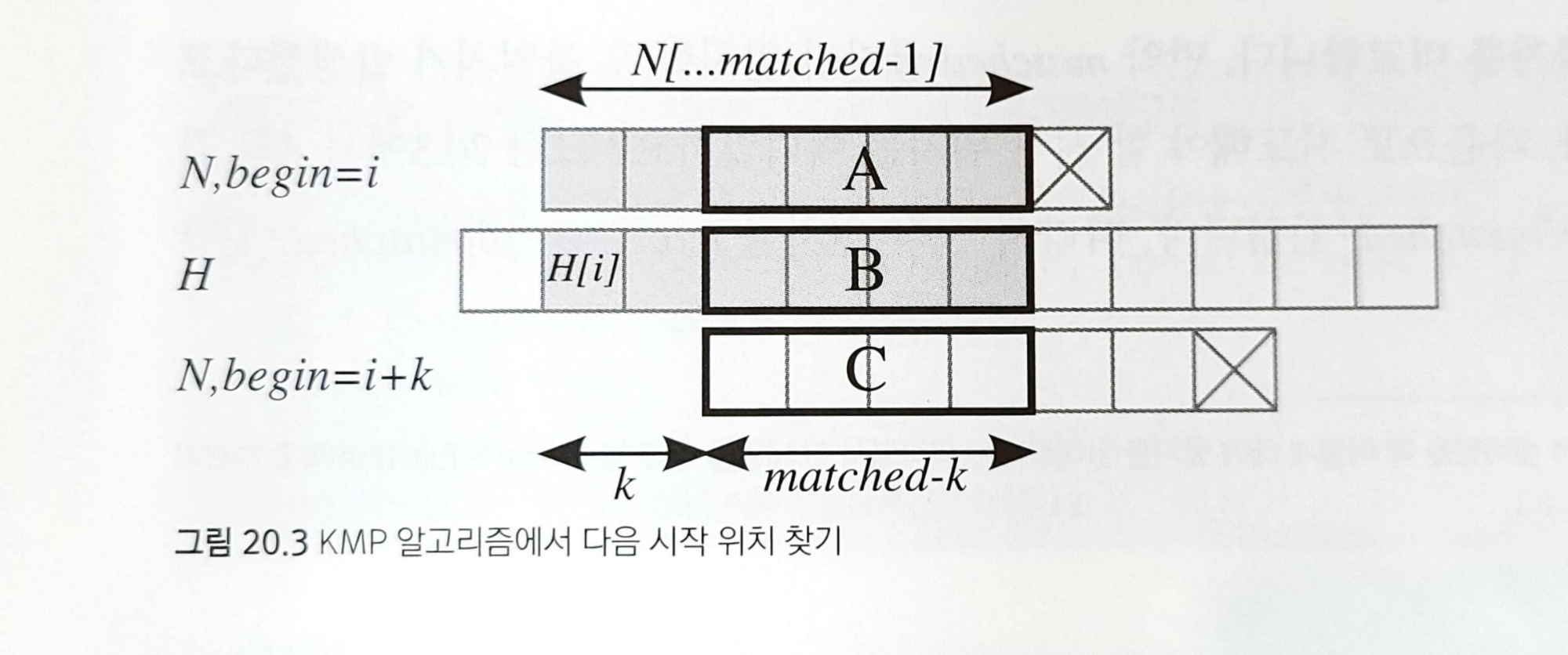 이를 통해 정답일 수 있는 후보인 T[(i + k)]로 이동하여 다시 비교를 시작하게 될 경우 블럭 A, B, C 가 일치해야한다는 것을 알 수 있었으며, 시작위치 T[(i + k)]에서 답을 찾을 수 있기 위해서는 P의 뒷부분인 A와 앞부분인 C가 같아야한다는 것을 알 수 있다. 때문에 '다음 시작 위치'는 P의 각 접미사(P의 뒷부분)에 대해 접두사도 되고, 접미사도 되는 문자열의 최대 길이일 것이라는 결론을 생각해볼 수 있다.