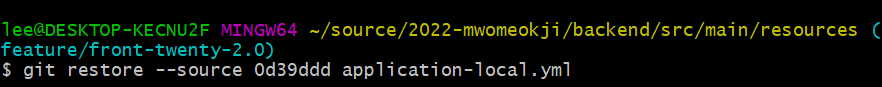 - 변경이 발생한 파일의 최신 버전 commit hash 를 확인한 후, git restore --source [commit hash] [file name] 을 이용하여 해당 파일만 원래 상태로 되돌리기