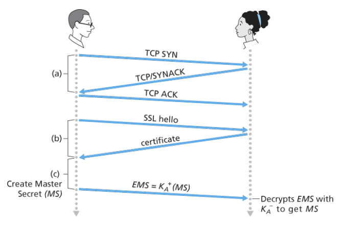 handshake 단계는 Bob 과 Alice 의 TCP connection (a) 단계, Alice 가 정말 Alice 인지 검증하는 (b) 단계, Alice 에게 SSL session 을 위해 필요한 대칭키들을 생성하기 위해 Bob 과 Alice 모두에게 사용될 대칭키를 전송하는 (c) 단계 총 세 단계로 구성됩니다. (Bob 은 클라이언트, Alice 는 서버입니다.)