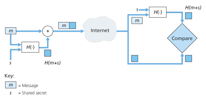 - 그 후, Alice 는 MAC 을 원래 메시지 m 에 붙여 (m, H(m + s)) 를 Bob 에게 전송합니다.