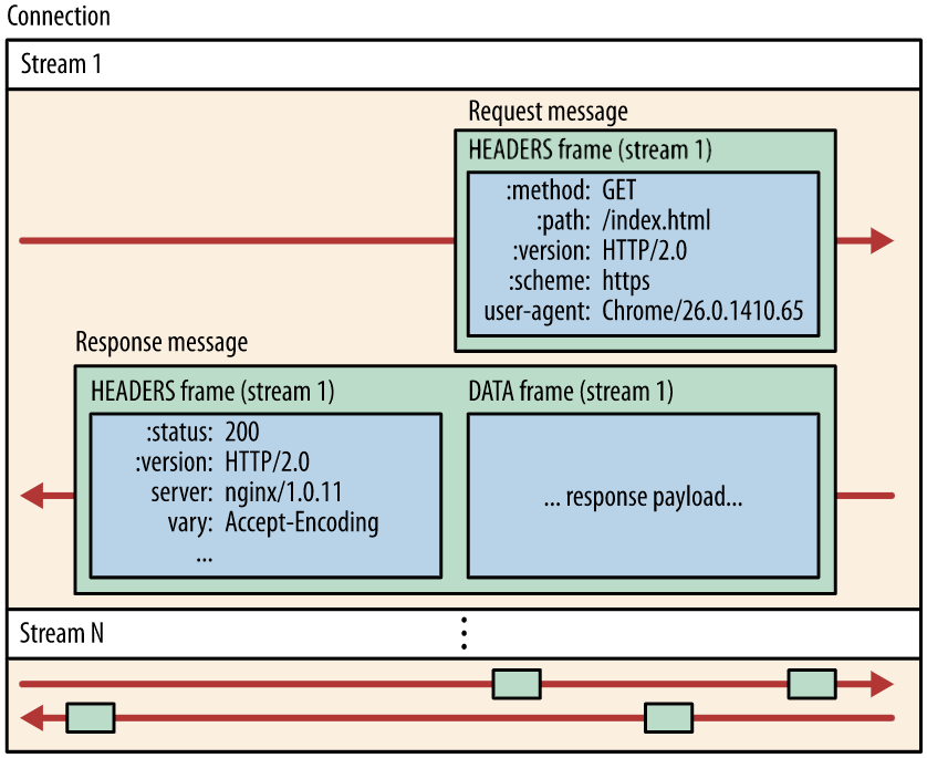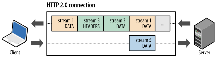 HTTP/2 의 모든 통신은 여러개의 양방향 스트림을 전송하는 단일 TCP 연결에서 수행되며, 각 스트림은 고유의 식별자와 우선순위 정보를 가진다. 또한 스트림에 포함된 각 메시지들은 request, response 와 같은 하나의 논리적 HTTP message 이며, 하나 혹은 그 이상의 프레임들로 구성된다.
