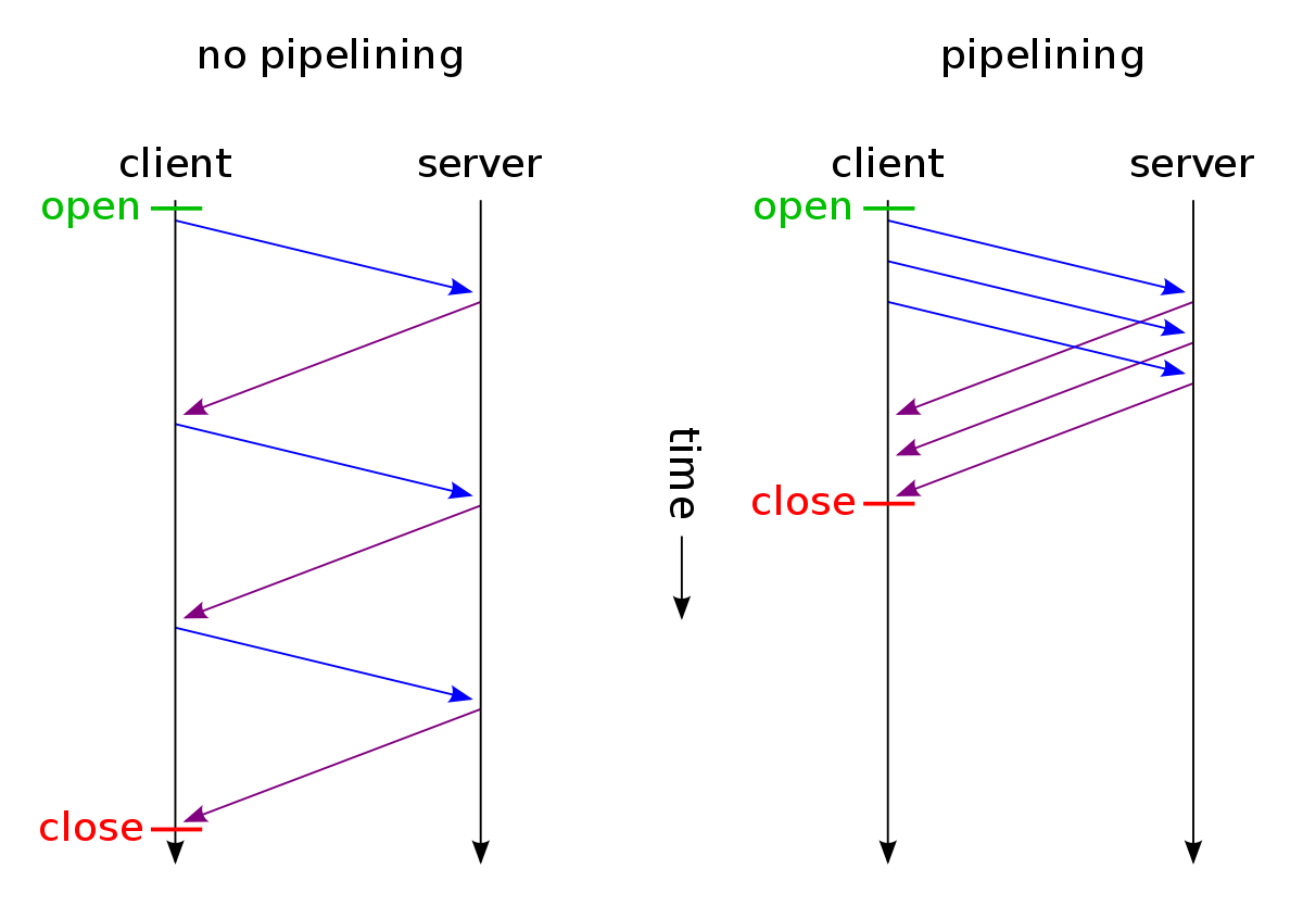 파이프라이닝 기능이 없는 경우 하나의 request 와 response 가 모두 진행된 후, 다음 request 와 response 가 진행된다. 때문에 request 가 많으면 많을수록 매 연결마다 TCP 연결이 필요하므로 응답지연이 늘어날 수 있다. 또한 앞의 request, response 에서 문제가 발생한다면, 다음 request 와 response 는 진행되지 못하게 되는 문제가 발생할 수도 있다. 파이프라이닝은 이를 개선한 것으로 각 request 에 대해 각각 response 를 반환하는 방식으로 앞의 문제를 해결한다.