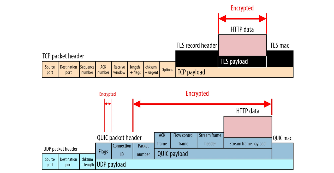 QUIC 은 TCP 와 마찬가지로 처음에 TLS handshake 를 이용한다. 그러나 이후에 TCP 위의 TLS 에서는 TLS 가 암호화를 수행하는 반면, QUIC 은 packet 들을 스스로 암호화한다. 이러한 차이를 통해 다음과 같은 이점들을 얻을 수 있다.