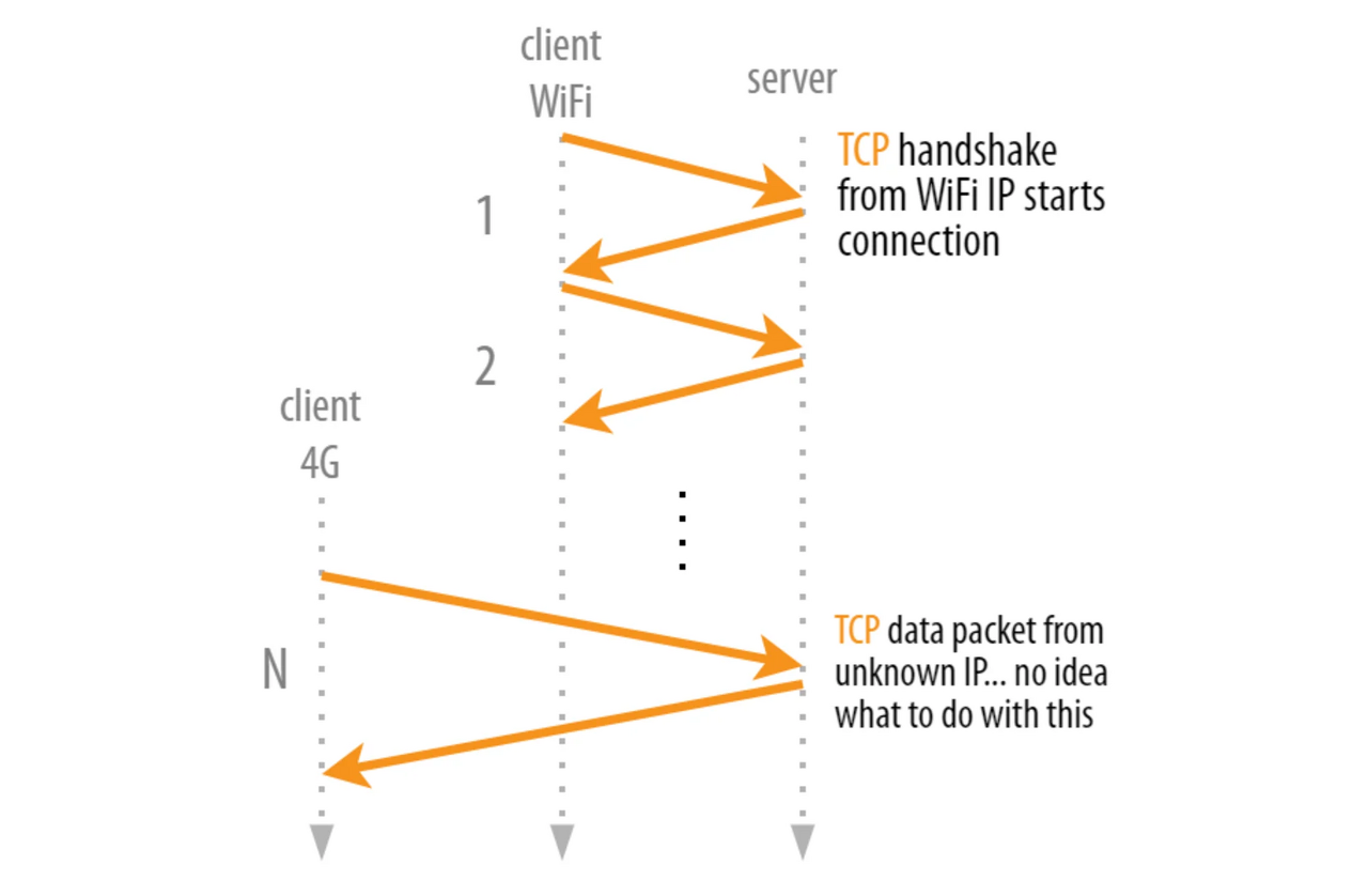TCP 는 우리가 스마트폰 등을 사용할 것이라고 꿈꾸기 이전에 개발되었다. 때문에 클라이언트가 서버에게 자신의 IP 가 바뀌었음을 알릴 어떠한 메커니즘도 존재하지 않는다.
